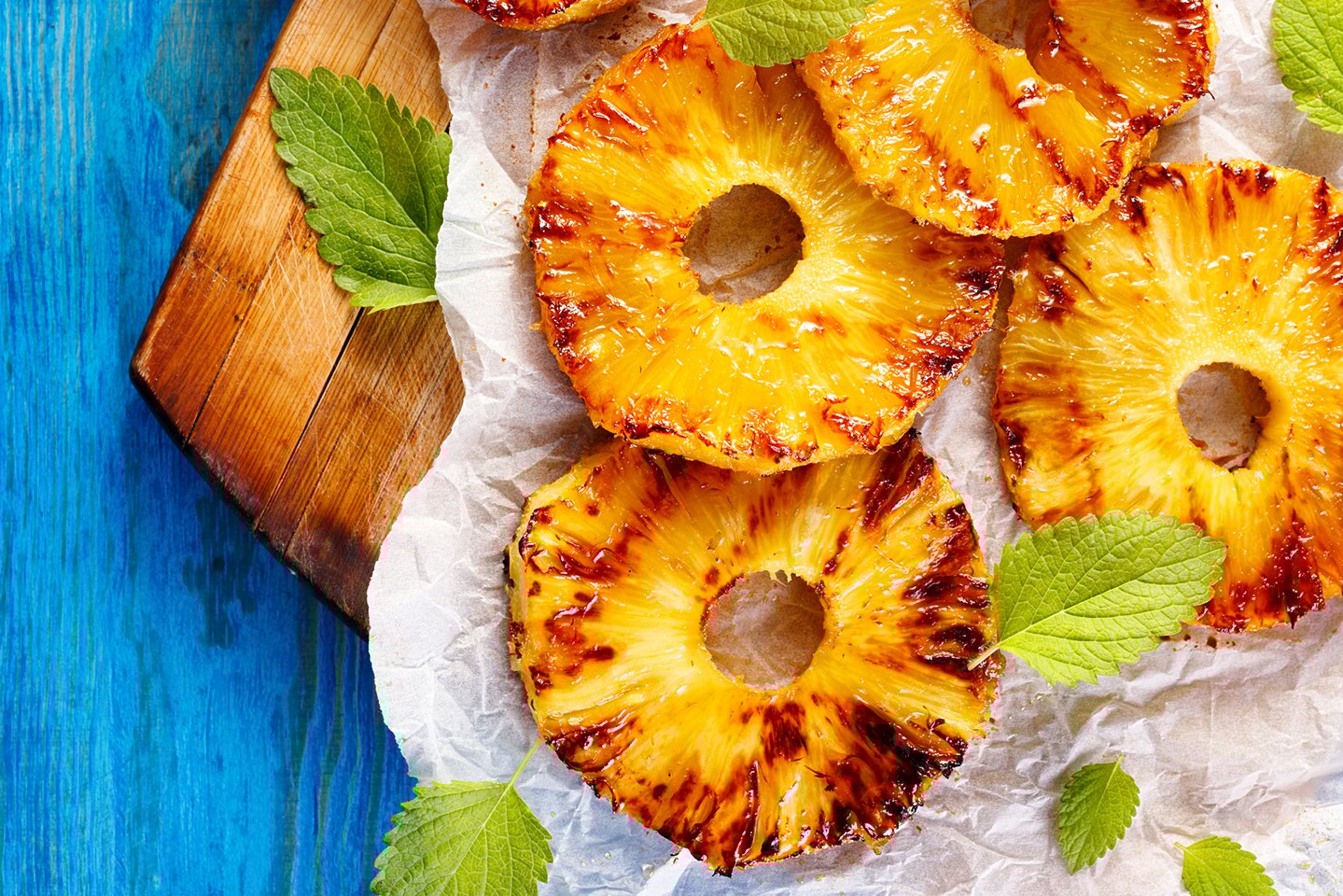 - Så har vi ananasen, da: Den er kongen av frukt som passer å grilles. Den kan grilles så lenge at den nesten faller fra hverandre, og blir bare bedre og bedre jo flere grillstriper den får. Prøv den med revet limeskall, pisket rømmekrem og kanskje ei litta klunk mørk, karibisk rom?