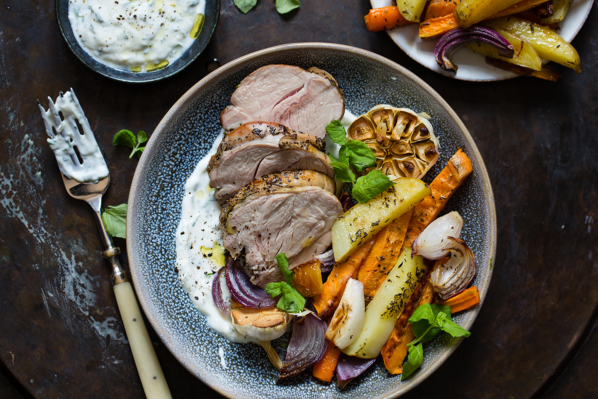 Lag yoghurtdressingen ved å røre sammen gresk yoghurt, finrevet sitronskall, sitronsaft, olje, salt, pepper og hakket fersk mynte.