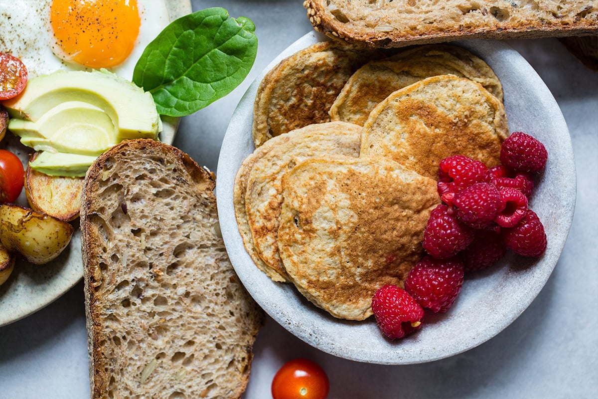 Yoghurt med granola og bær og bananpannekake
