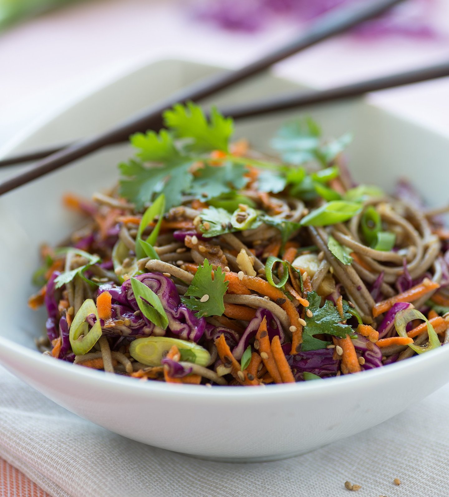 Vend nudler, kål, vannkastanjer og gulrøtter i dressingen, dander på et fat og strø over (eventuelt) fritert løk, eplestaver, noen limebåter, koriander og ristede sesamfrø.