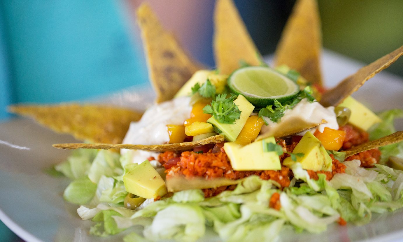 Skjær salaten litt grovt og bland med halvparten av dressingen, dander i en bolle med stekte maiskorn, resten av avocadoen kuttet i biter, cherrytomater delt i to, nachochips, limebåter og koriander.